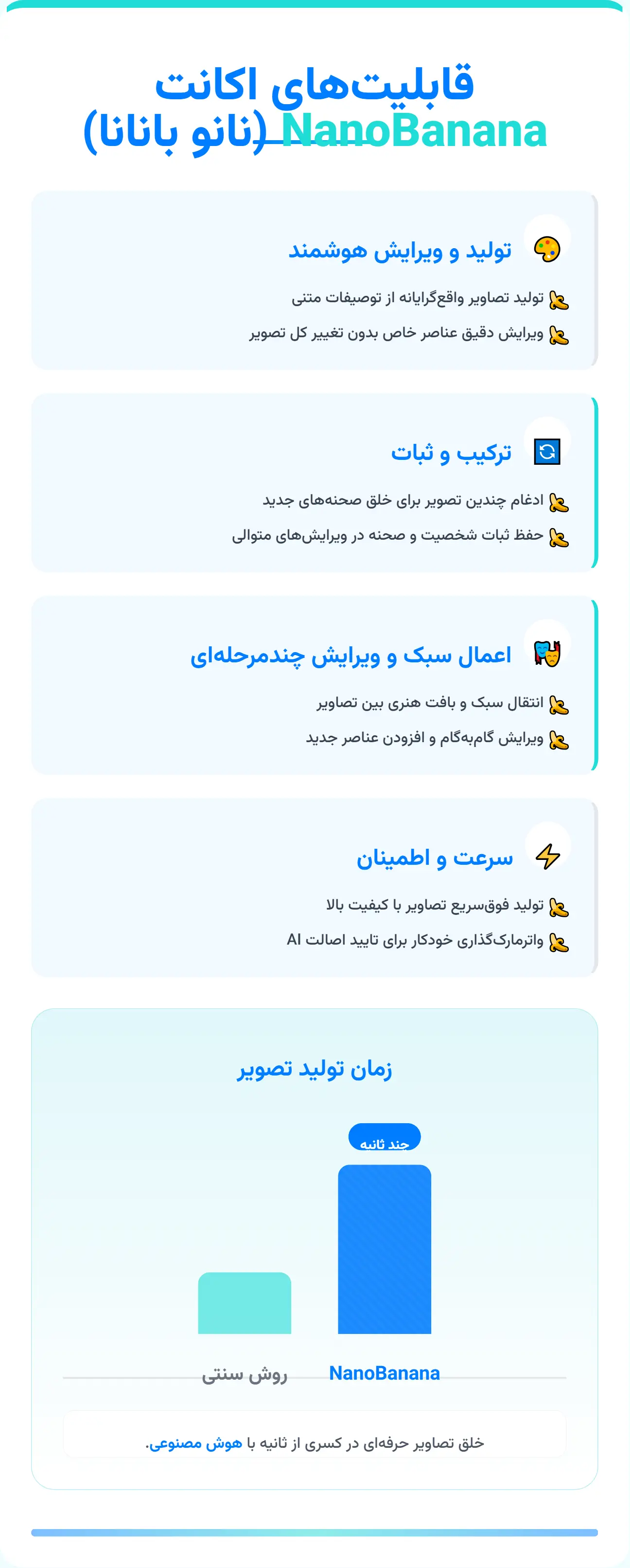 نانو بنانا (Nano Banana) یک پلتفرم پیشرفته تولید تصویر مبتنی بر هوش مصنوعی (AI Art Generator) است که به کاربران اجازه میدهد تا توصیفات متنی (پرامپت) خود را به تصاویر بصری باکیفیت و حرفهای تبدیل کنند. این سرویس بر ارائه مدلهای پیشرفته و ابزارهای ویرایشی برای طراحان، هنرمندان دیجیتال و آژانسهای خلاق تمرکز دارد.