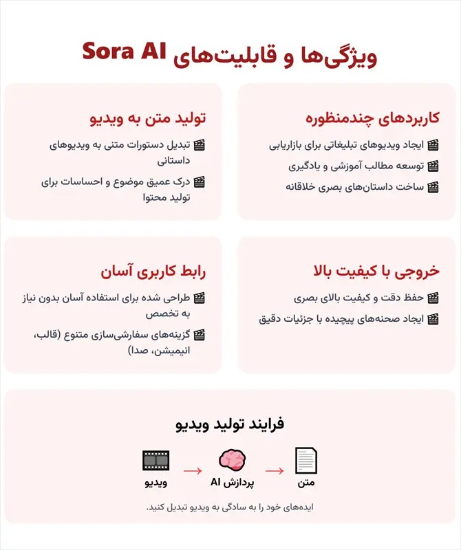 بزرگترین مزیت Sora، توانایی آن در خلق ویدیوهایی با کیفیت سینمایی، تنها با استفاده از کلمات است. این ویژگی نیاز به دوربین، تیم فیلمبرداری و لوکیشن را به طور کامل حذف کرده و به شما اجازه میدهد تا هر ایدهای، هرچقدر هم که پیچیده باشد را به یک ویدیوی حرفهای تبدیل کنید.