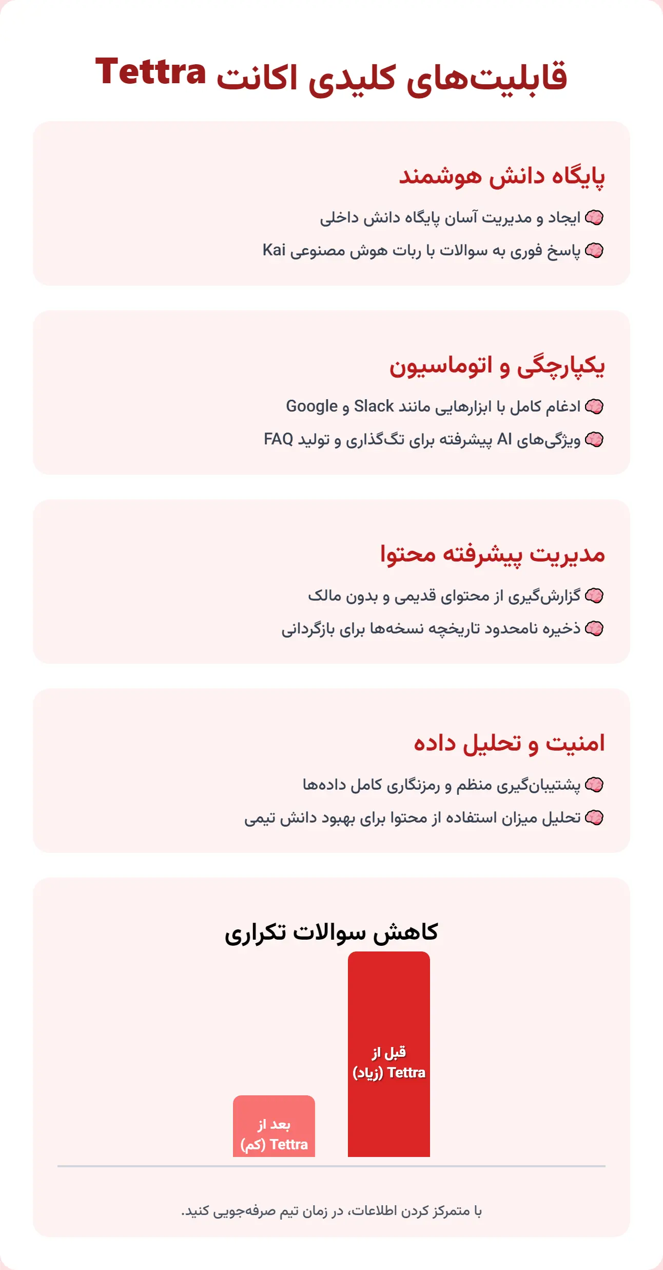 مهمترین مزیت Tettra، ایجاد یک منبع واحد و قابل اعتماد (Single Source of Truth) برای تمام دانش سازمانی است. کارکنان میتوانند به سرعت پاسخ سوالات خود را پیدا کنند، فرآیندهای استاندارد را مشاهده نمایند و از آخرین بهروزرسانیها مطلع شوند، بدون آنکه نیاز به جستجو در کانالهای چت پراکنده یا پرسش مکرر از همکاران داشته باشند.