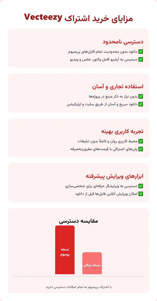 با اشتراک Pro، شما میتوانید به صورت نامحدود از کل کتابخانه Vecteezy، شامل میلیونها وکتور حرفهای، عکسهای باکیفیت و فوتیجهای ویدیویی 4K، فایل دانلود کنید. این مدل دانلود نامحدود، آن را به یک جایگزین یا مکمل قدرتمند برای دیگر سرویسهای محبوبی مانند اشتراک Freepik تبدیل میکند.